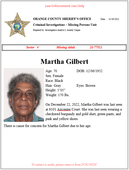 Age 70 Race:Black Sex: Female Height: 5’05″” Weight: 170 Hair: Gray Eyes:Brown Last Seen Wearing: Checkered burgundy and gold shirt, green pants and pink and yellow shoes. Missing Since: 12/22/22 Additional Information: Last seen at 8101 Aircenter Court.