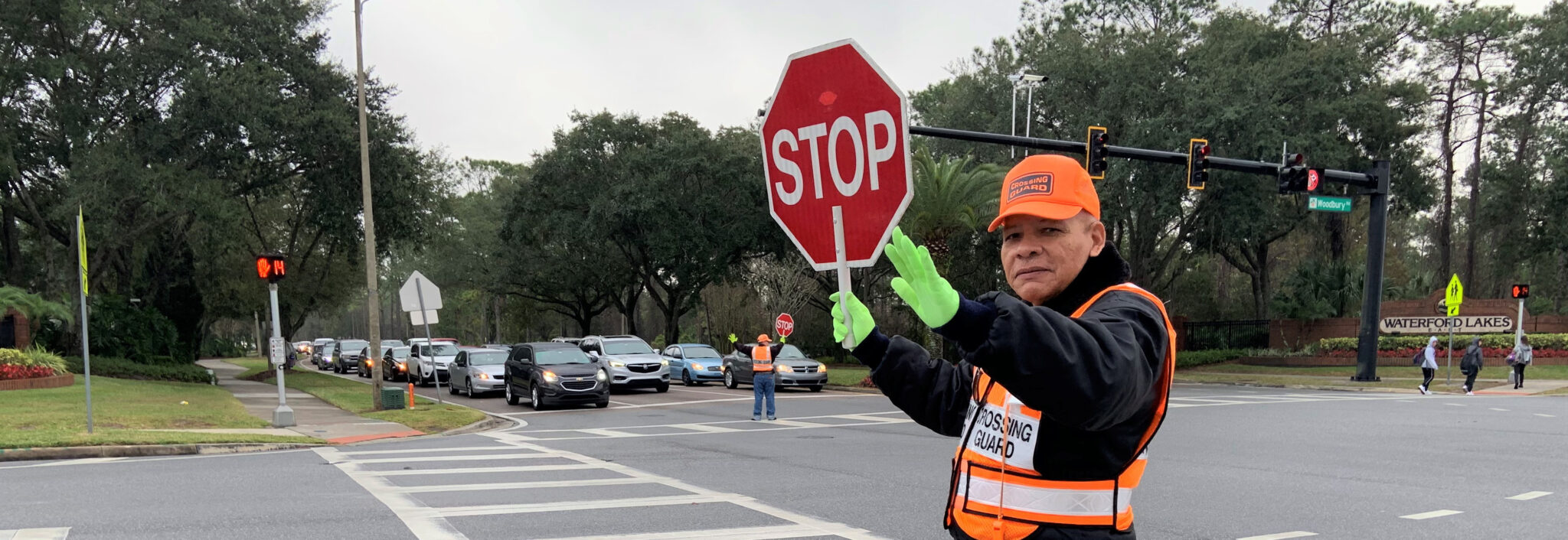 a crossing guard waving to the camera